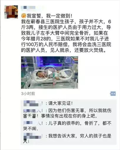 但患儿父亲极为不满,坚持认为是医生在接生孩子时,由于用力过猛导致骨折,并在微信朋友圈发出索赔100万、血洗医院的威胁。