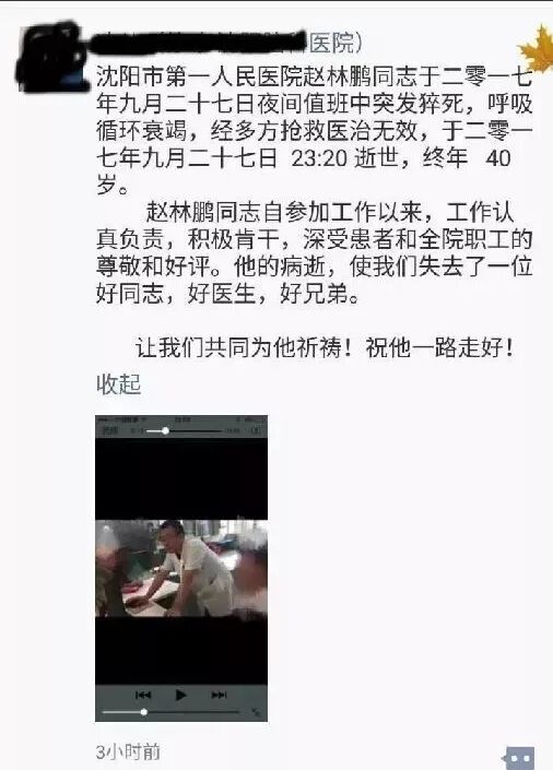 9月27日沈阳市第一人民医院神经内科赵林鹏医生夜间值班中突发猝死,终年40岁,家中留下了一个4岁的孩子。