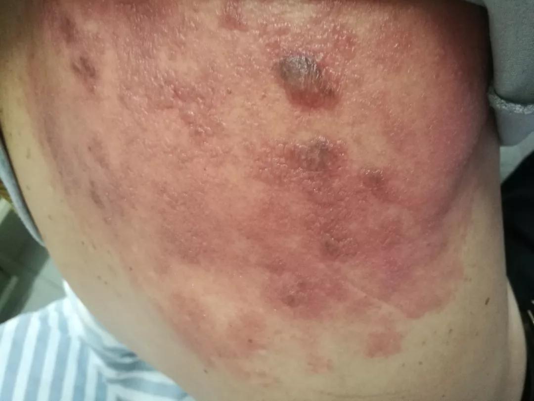 就诊前一天左侧上肢也发现成簇丘疱疹,均以尺侧为主。