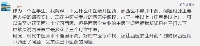 从以上留言的点赞数来看,多数人是认同中医可以开西医的;笔者也采访了多位中医医院管理者,询问中医院是否有对中医开西药的限制?得到的答案是“没有”。