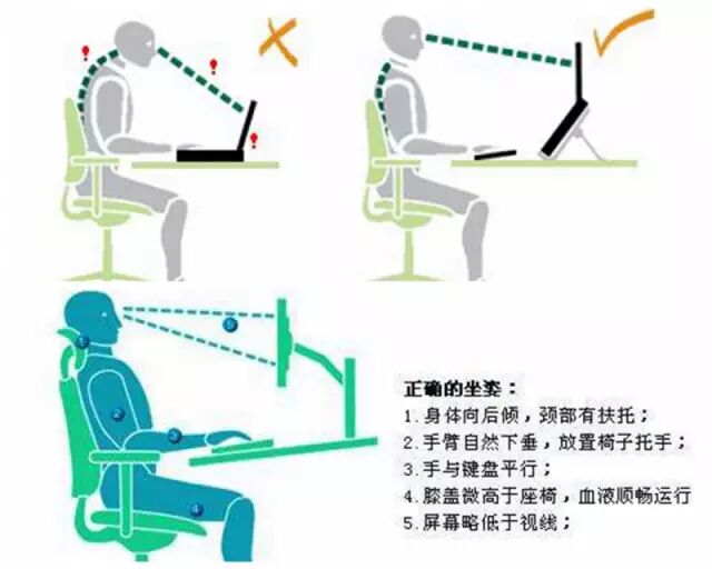 此外,因为坐姿比其它任何姿势给予脊柱的压力都大,所以频繁更换姿势很重要。如果条件允许,最好每一小时至少离开座位去走动几分钟。